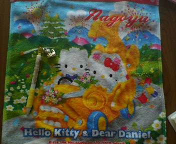 それは、名古屋柄の車に乗るキティちゃんとダニエルくんのハンドタオル(名古屋柄=金のしゃちほこ)